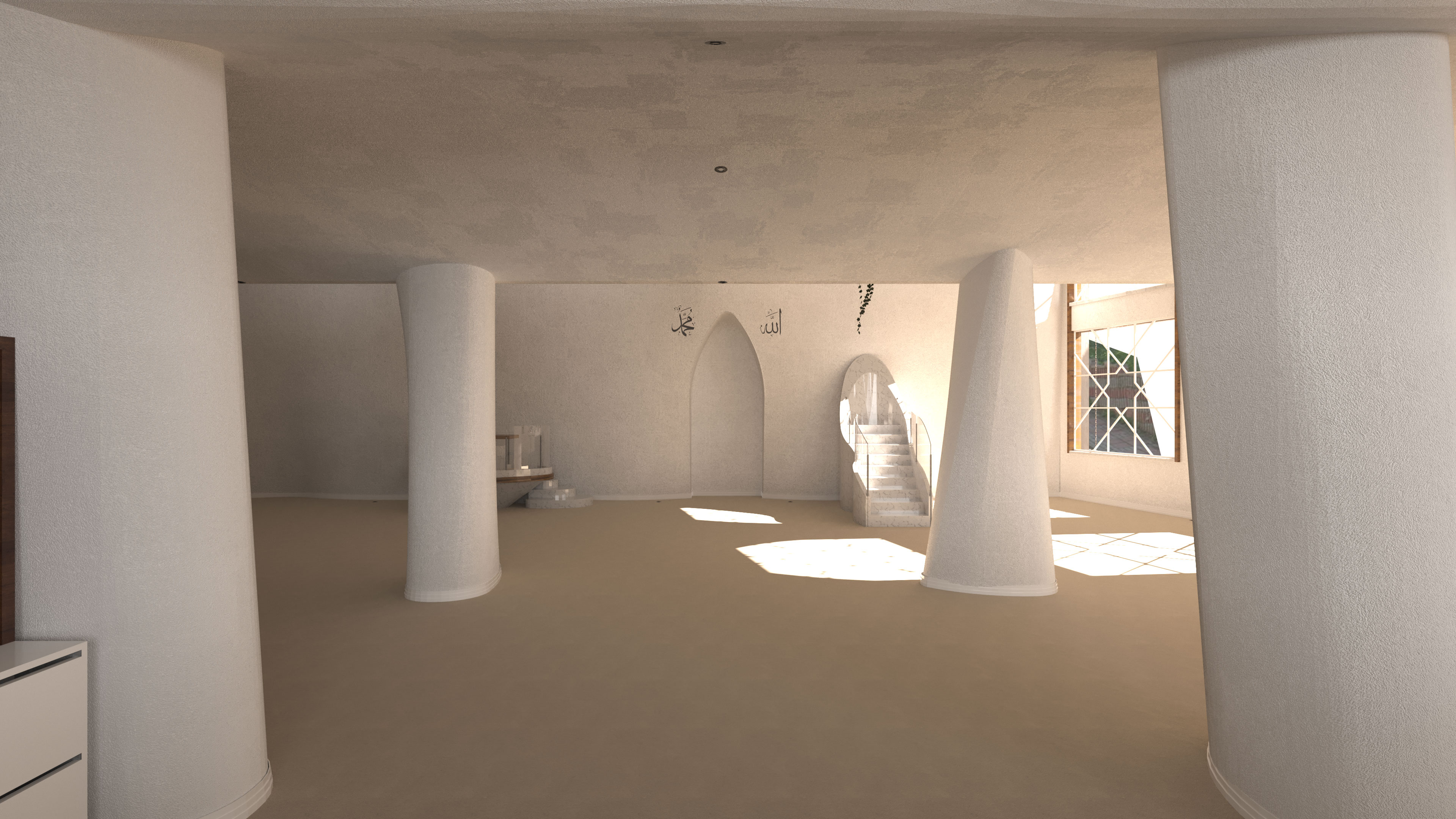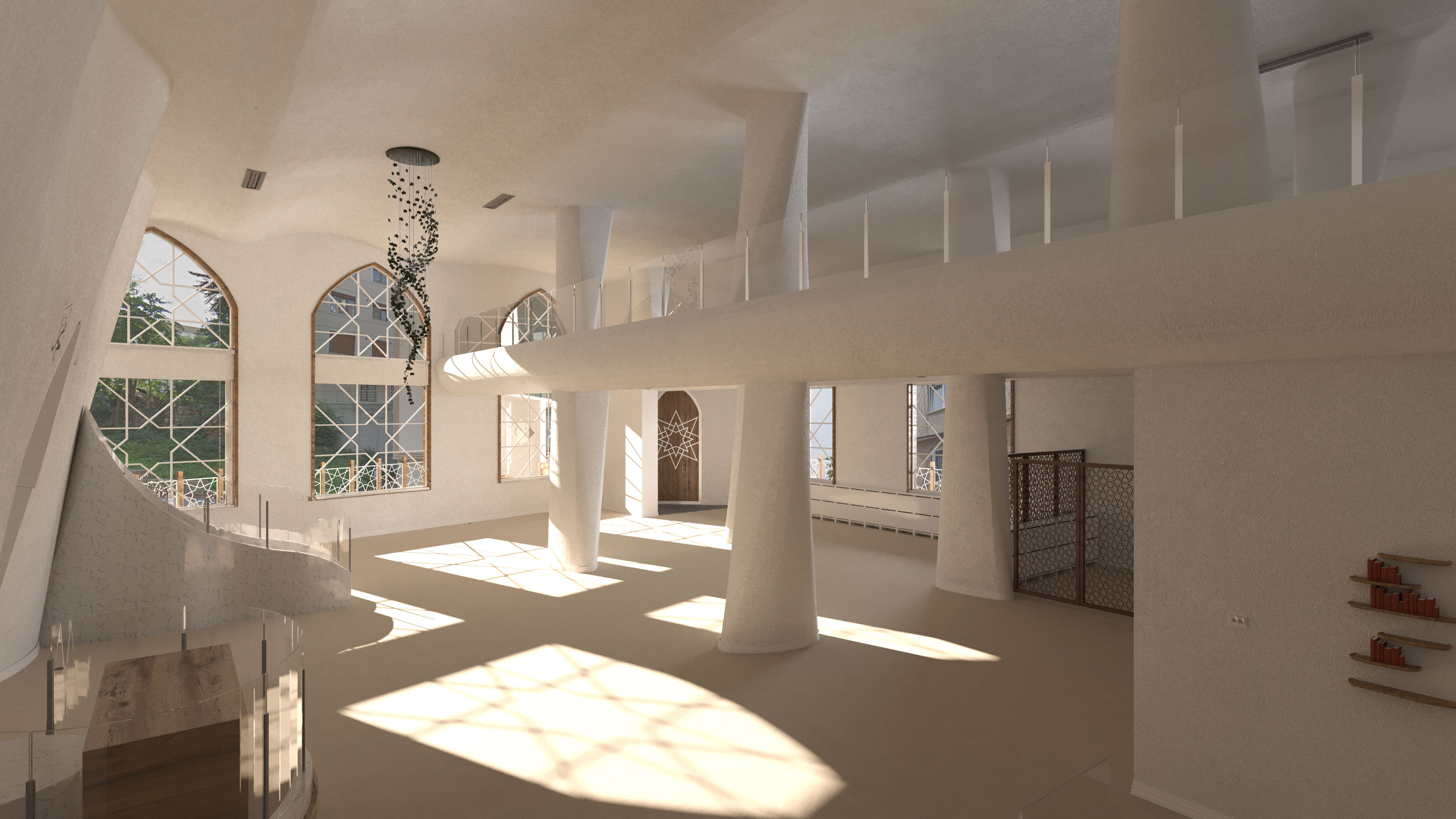 Mekânda yer alan kıvrımlı merdiven, sadece işlevsel bir geçiş unsuru değil; aynı zamanda yapının simgesel ve mekânsal omurgasıdır. Yukarıdan bakıldığında bir spiral gibi görünen bu form, ruhsal bir yönelim hissi uyandırır. Işık, cephedeki geniş ve kemerli pencerelerden içeri süzülerek gün boyunca mekânın değişen atmosferine katkı sağlar. Geometrik desenli pencere detayları, geleneksel motifleri çağdaş bir çizgiyle yorumlarken, iç mekândaki gölge oyunlarına da katkı verir.